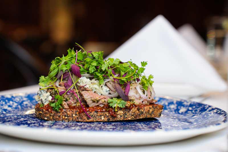 - Beef Crostini: Roasted, shaved and chilled prime rib marinated in garden herb pesto and served on toasted Field & Fire bread with tomato-chili jam.